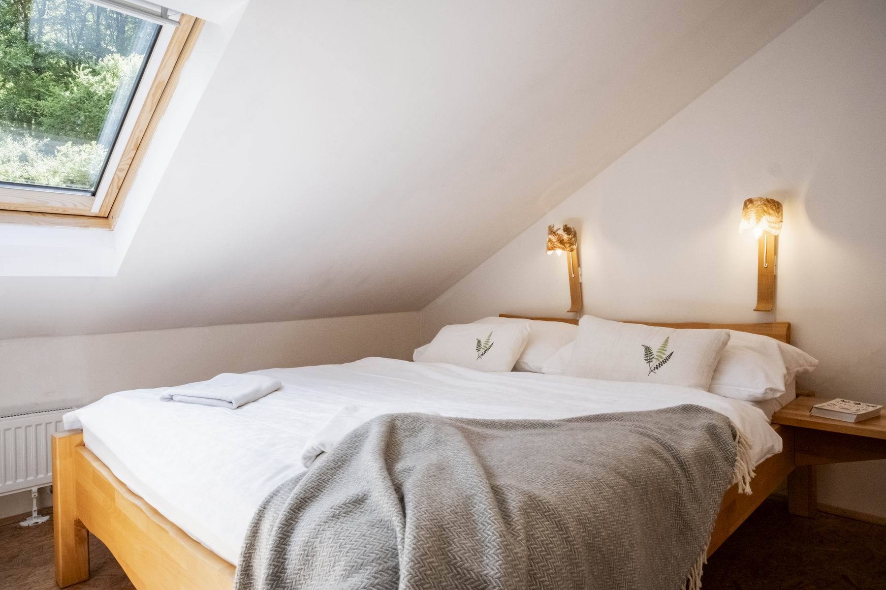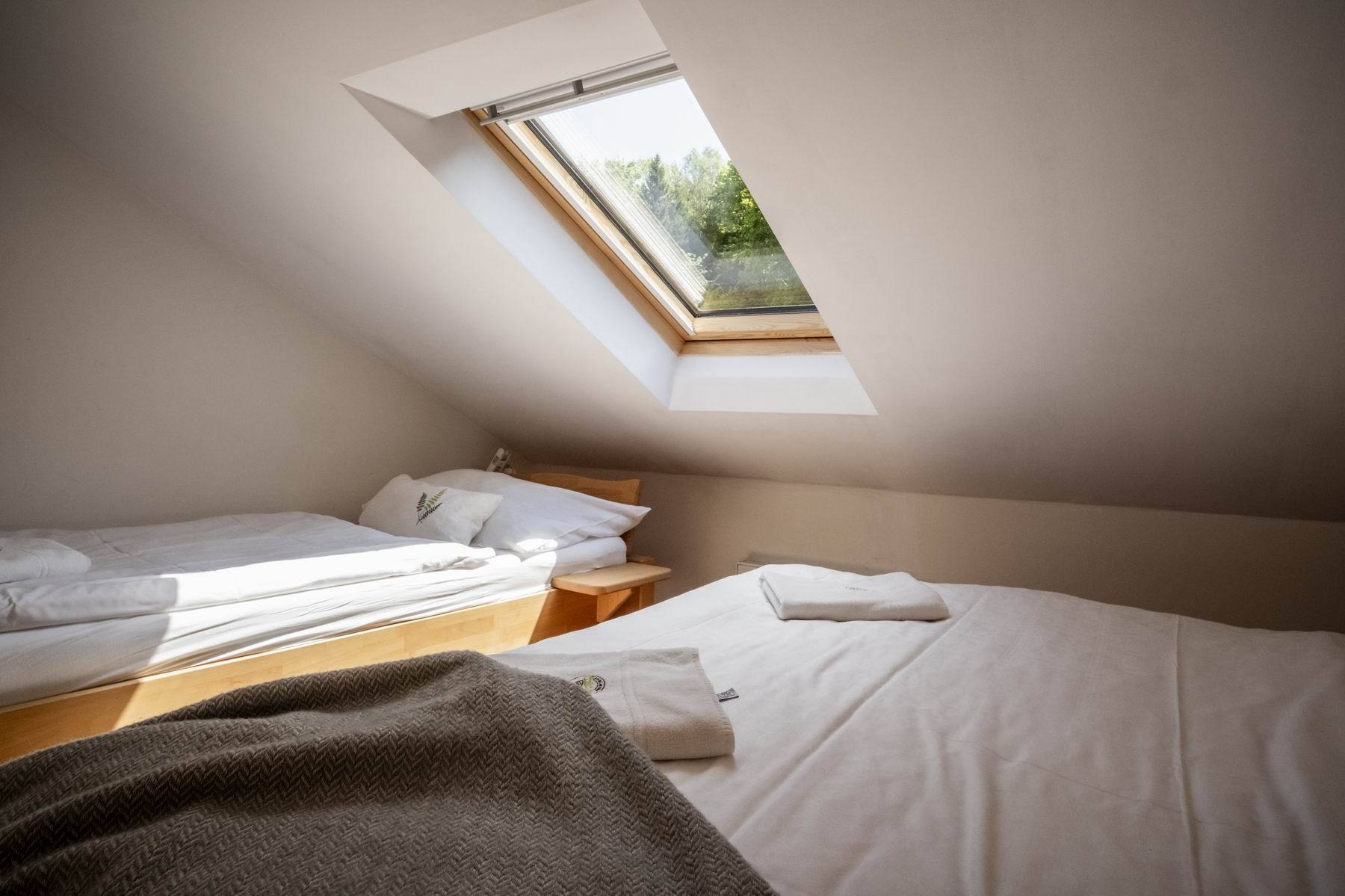 Beskrivelse: Bo komfortabelt i vores største suite, som har to separate soveværelser med skrå lofter, hver med en dobbeltseng og en enkeltseng (sover 6 i alt), et ovenlysvindue med udsigt til himlen og en indiansk drømmefanger til dine søde drømme .. I den rummelige opholdsstue med udstyret tekøkken kan du sidde ved det store bord eller i sofaen, lægge noget væk i den rummelige kommode eller garderobeskabet i soveværelset. Det separate badeværelse har bruser, toilet.