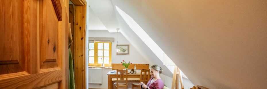 „Skoro do nebe …“ Cena: od 2900 Kč Kapacita: 4 lůžka Popis: Apartmán s výhledem na západ slunce. Obývací část s vybaveným kuchyňským koutem, posezením u stolu, komoda, křeslo na čtení s lampou. Koupelna, sprchový kout, wc. Samostatná ložnice s manželskou postelí a dvěma jednolůžky se nachází nahoře v půdním prostoru. Vzhledem k mlynářským schodům do ložnice zvažte […]