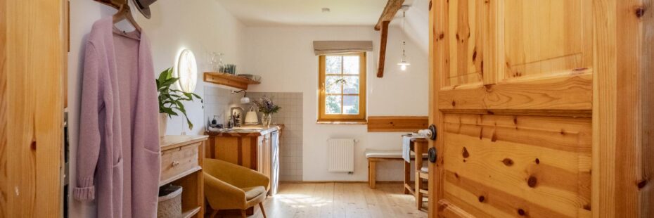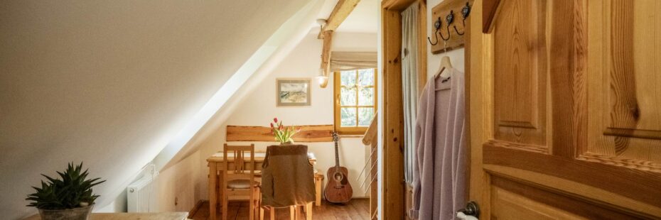 „Skoro do nebe …“ Cena: od 2250 Kč Kapacita: 4 lůžka Popis: Apartmán s výhledem na východ slunce. Obývací část s vybaveným kuchyňským koutem, posezením u stolu, komoda. Koupelna, sprchový kout, wc. Samostatná ložnice s manželskou postelí a dvěma jednolůžky se nachází nahoře v půdním prostoru. Vzhledem k mlynářským schodům do ložnice zvažte pobyt s velmi malými dětmi (schody […]